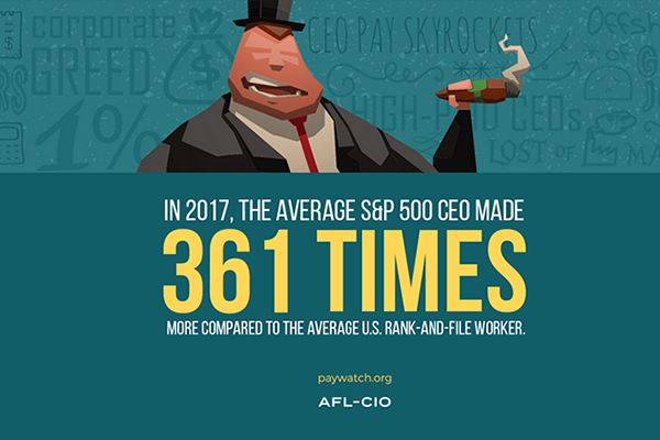 Once again there’s more for them and less for us. The imbalance between the pay of CEOs and working people continues to increase. In 2017, CEO pay at S&P 500 Index companies increased to an average of nearly $14 million while production and nonsupervisory workers received on average just $38,613. The AFL-CIO recently released its…